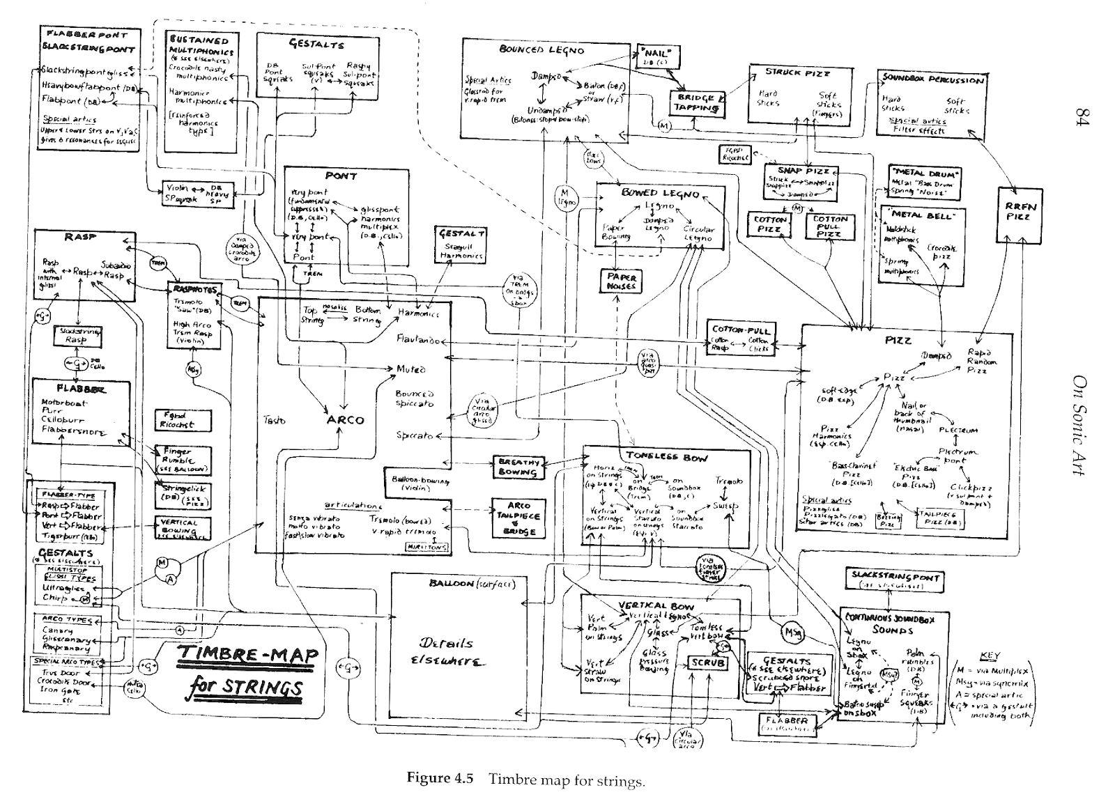 Here is an inspiring Timbre Map for Strings drawn by Composer Trevor Wishart. He presents different classes of sounds and connects them in a graphical way recalling the mind map technique: